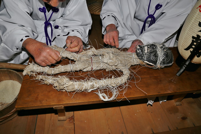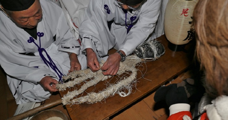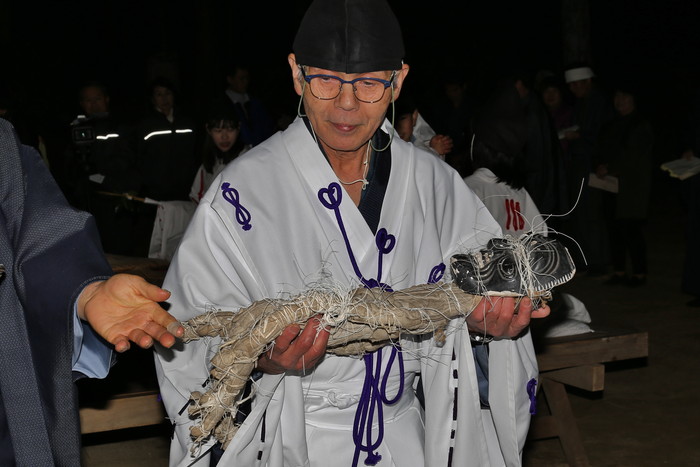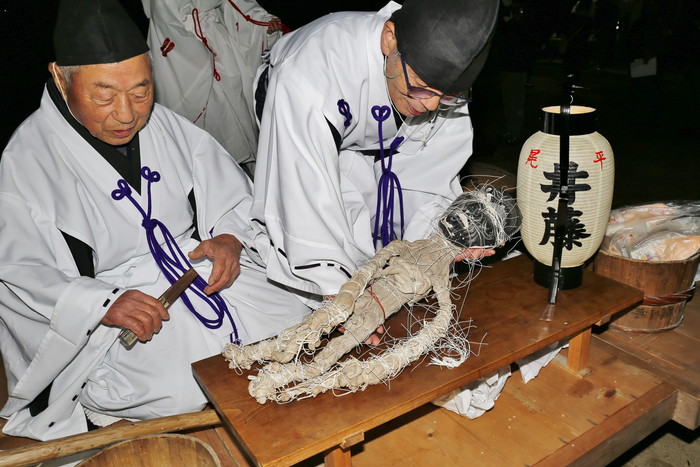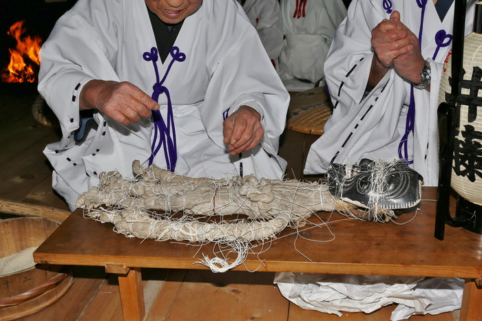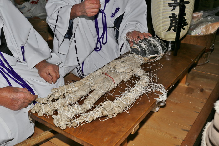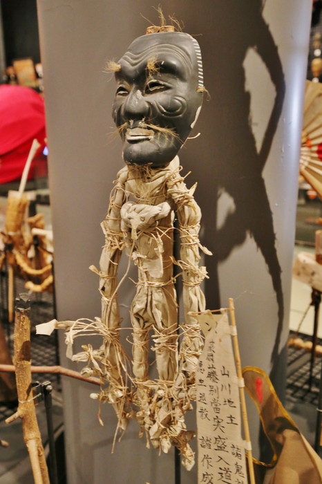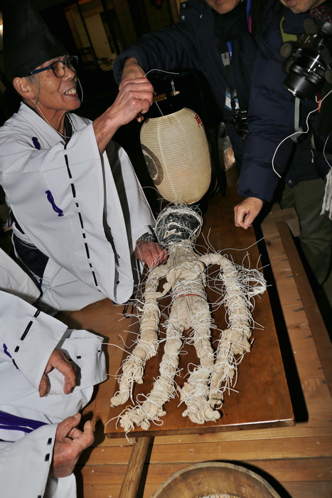 それにしてもこの異様な姿はどうだろう。真っ黒い翁の面、麻布で覆われた身体、そして何よりも目を引くのは全身のあちこちを縛っている無数の紐。本当に日本の神様なのか? なんだこのチマキの親分みたいな神様は? 迫力あり過ぎじゃないか!