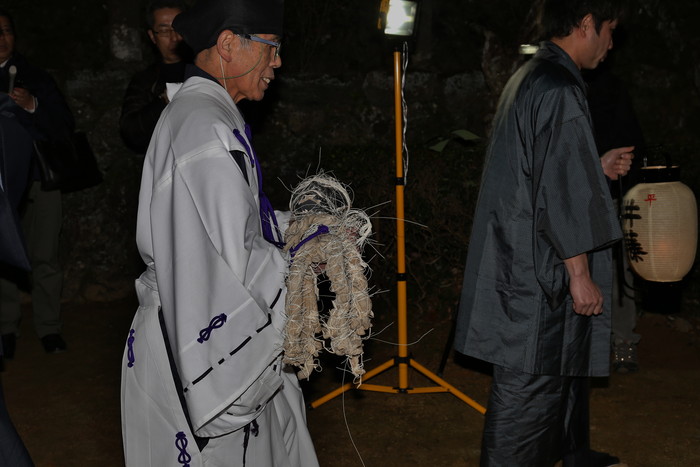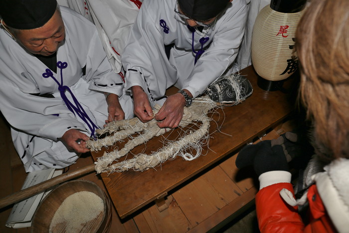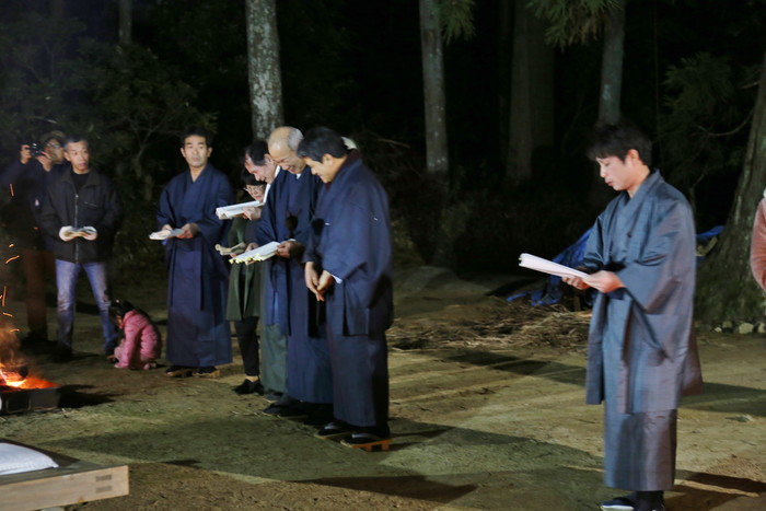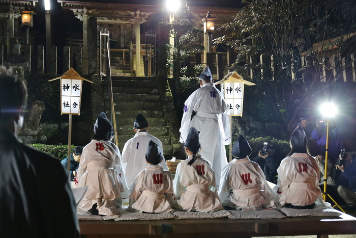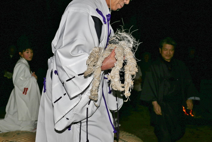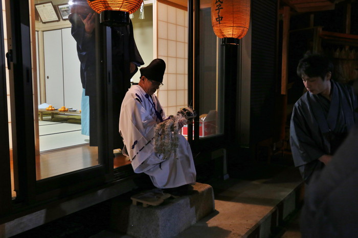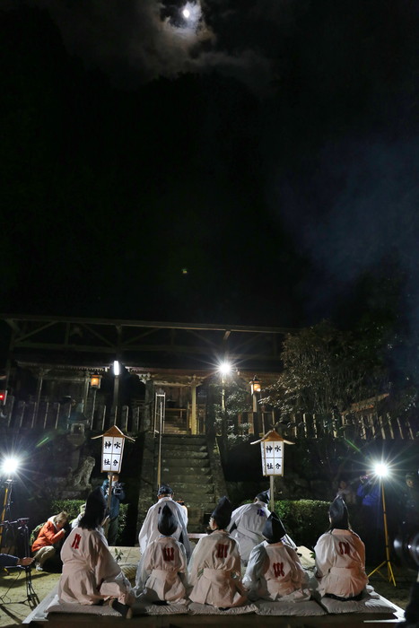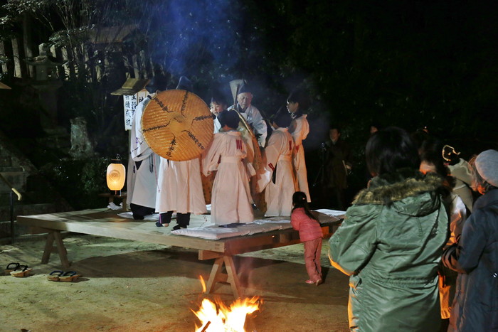 そんな平尾水分神社の祭りに行ってみた。真冬の大宇陀は寒く、それ以上に街路灯もあまりないのでとにかく暗い。真っ暗な道を歩いて行くと神社が見えてきた。日が暮れて気温が下がり、空気が張り詰めて来た頃、祭りは始まる。