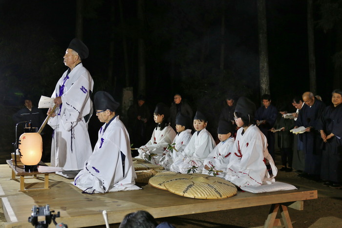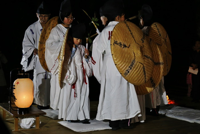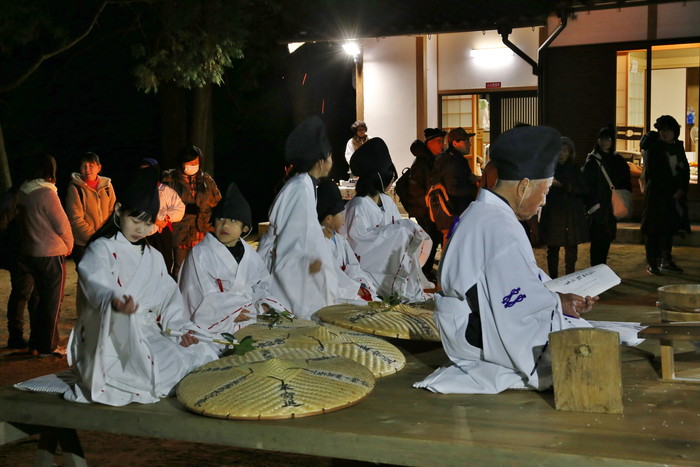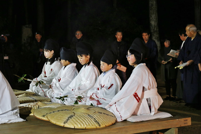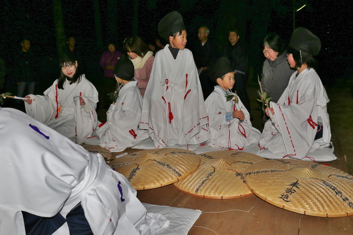 神前に設けられた舞台の上には、祭りを司る大当とそのサポート役の小当、そして後るに座るのは5人の子供たち、彼らはショトメ(早乙女の意)と呼ばれる。