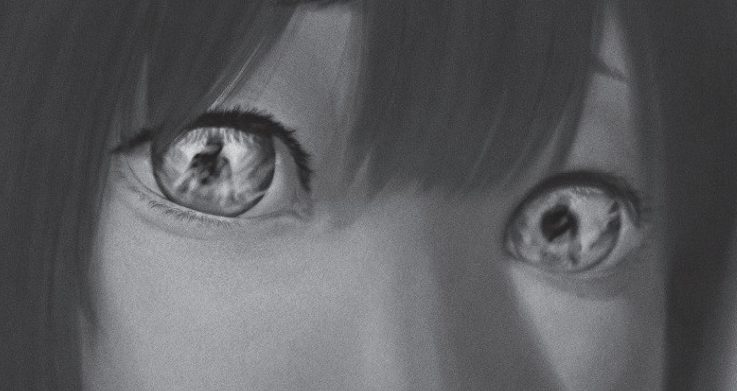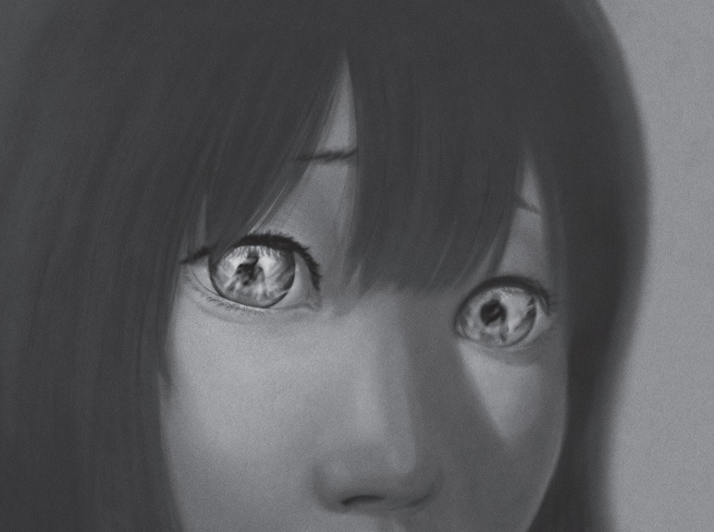 黒い円の中心に、黒い人の顔があった。輪郭が見え、鼻筋があり、目の部分だけが白くなっている。男だ。真っ黒い男が、右肩から自分の顔を覗きこんでいる。