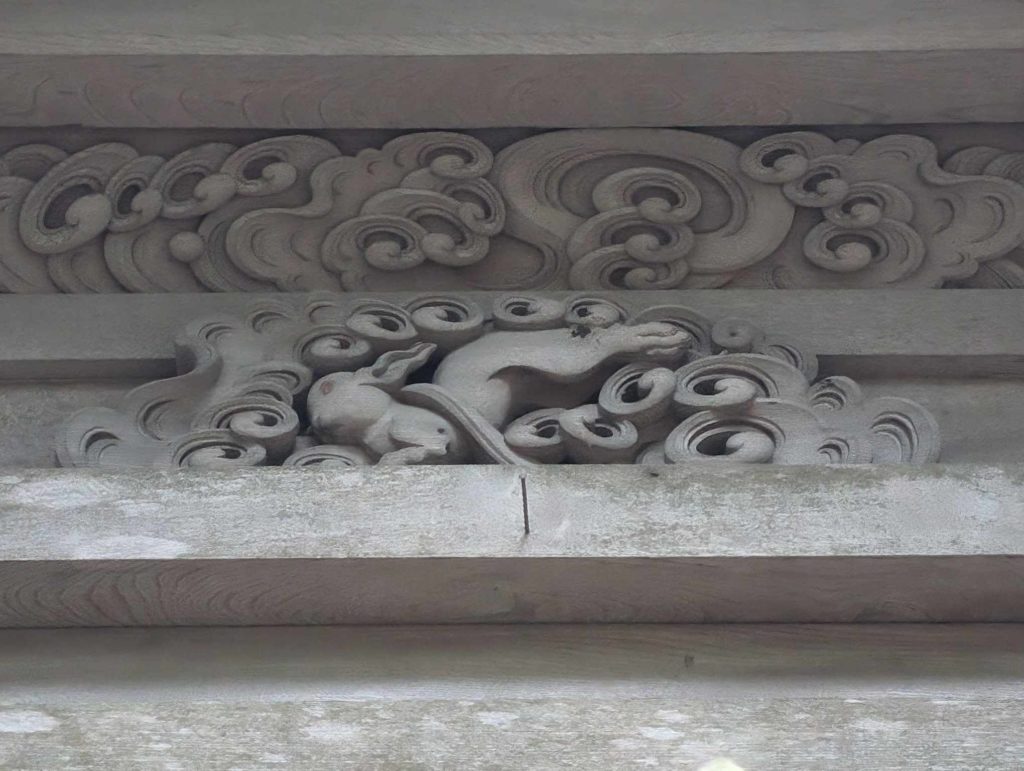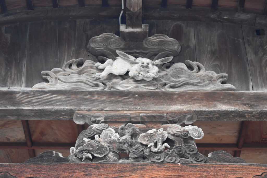 この神話にある通り、今も氏神として、八頭町にも白兎神社が鎮座する。それも、1~2キロの範囲で、三社もの白兎神社が連なっているのだ。これらの白兎神社は、明治から大正にかけて政府が進めた神社合祀の際、別の神社に合祀されたのだが、後に復興されて今に至っている。また、この中でも中心的な存在の福本白兎神社の社殿は、近くの青龍寺が引き取って、今も本堂内で厨子として祭祀に用いられている。そこには、波に乗る兎の彫刻も施されている。