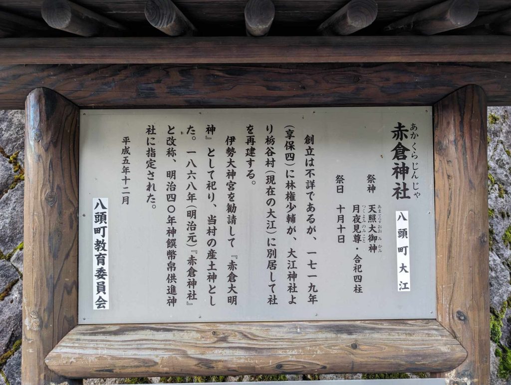 太古、この地の中山に天照大神が降臨した。そこで仮宮を建てようと四方を眺めると、白兎が現れ、天照大神の服の裾をくわえ、道案内をした。白兎は尾根続きの霊石山(れいせきざん)へ導き、そこに仮宮を営んだ。白兎はいつの間にかいなくなっていたが、実はその白兎は月読尊の化身だった。その為、後に道祖白兎大明神と称え、近隣四村の氏神として崇めた。やがて天照大神は東へ去り、但馬国(現在の兵庫県北部)との境の山を越える際、草木の枝葉が朝日に照り輝いて美しかった為、「日枝(ひえ)の山」と名付けた。