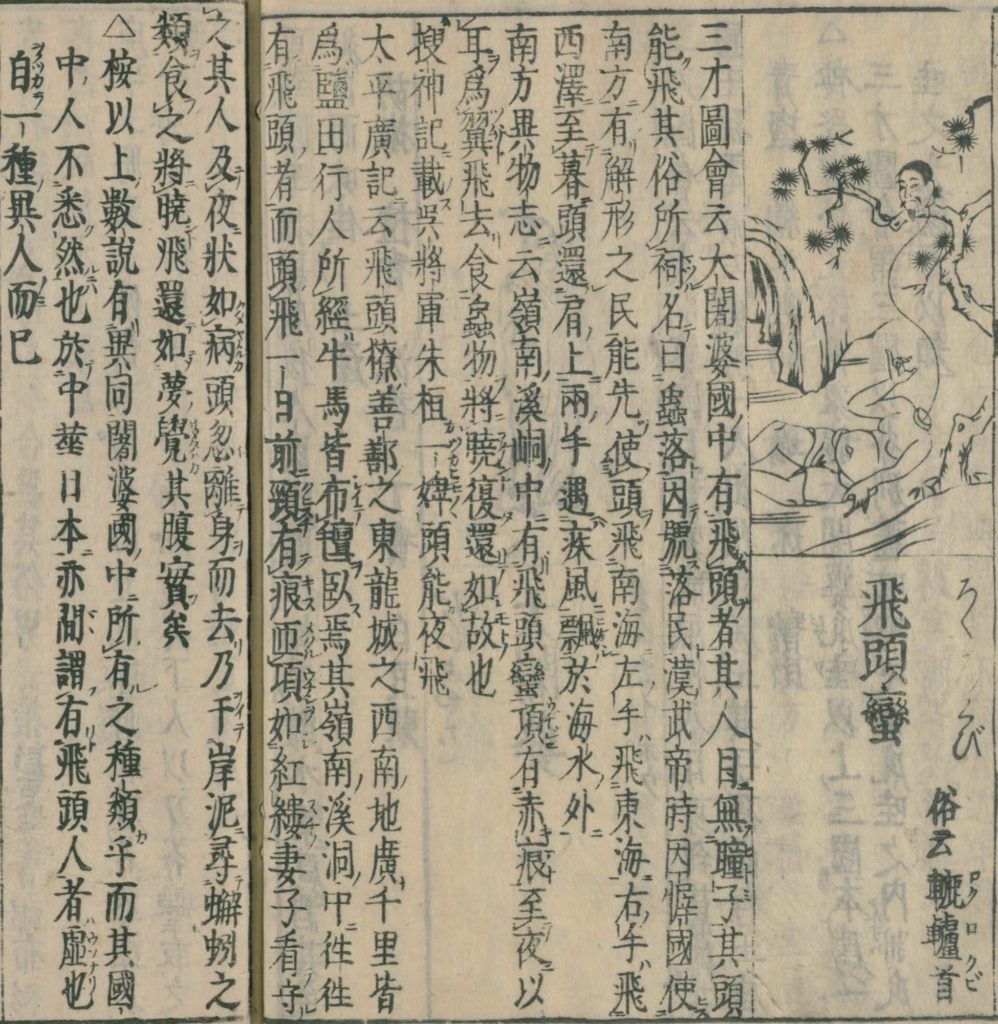 飛頭蛮、つまり頭が身体を離れて回遊する妖怪に蛮の名を付しているのは、この妖怪の出自が、中国より南であることを示していると考えてよいだろう。