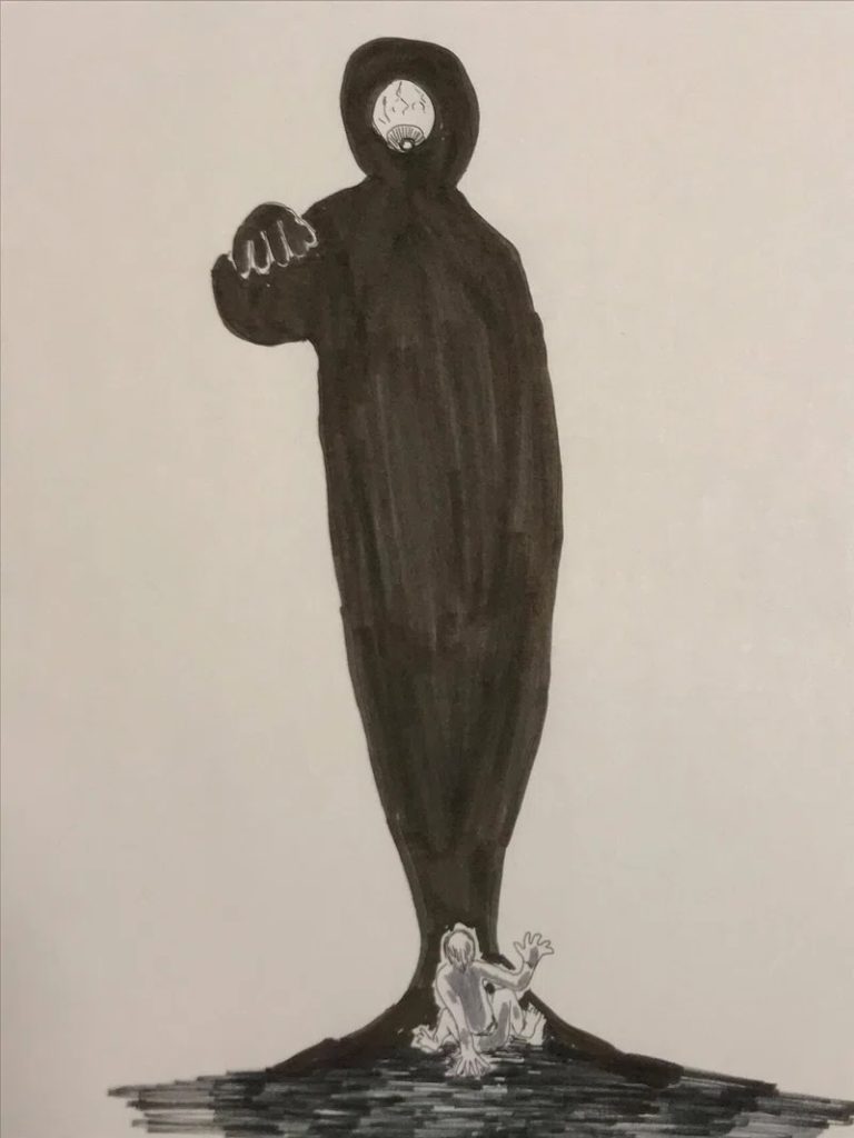 水木しげるはこれを人の形ではなく、目のある煙のような姿で描いておりますが、むくむくと空に膨れ上がっていく噴煙を思わせるその姿からは「次第に高く」なっていく様を容易に想像できます。