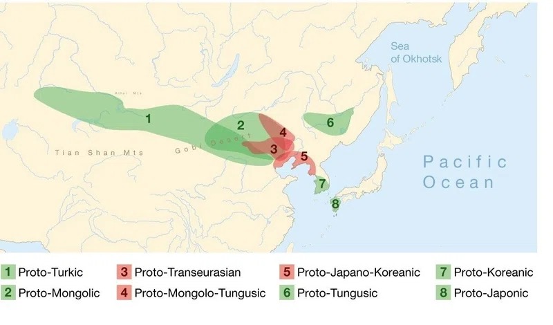 トランスユーラシア語族(アルタイ諸語)は日本語・韓国語・ツングース語・モンゴル語・チュルク語など98言語から構成され、東は日本、韓国、シベリアから、西はトルコにいたるまで、ユーラシア大陸全域に分布している。