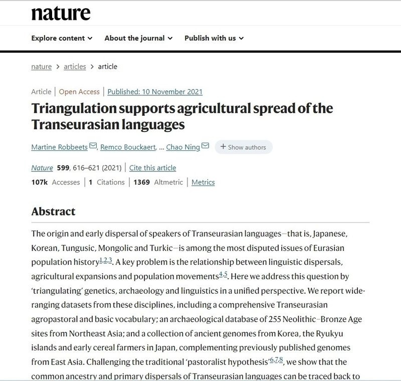 昨年の11月10日、イギリスの名門科学誌「ネイチャー」に「トランスユーラシア語族の諸言語は中国東北部にルーツをもつ」と結論づける新説が発表されて、ひとしきり話題を呼んだ(論文の原題はTriangulation supports agricultural spread of the Transeurasian languages)。