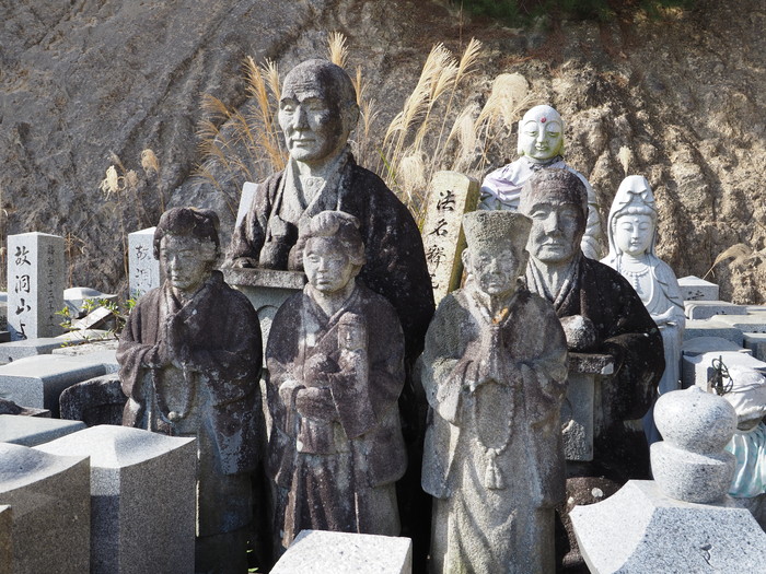 生前の姿を写したものだろうか、人物の石像などまである。中には髷を結った男性や結髪の女性などの石像まである。