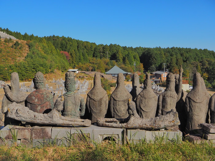 さらに再訪して御住職に話を伺うと、このコンクリ像群、かつては交通安全を願う地元の篤志家が高見氏に依頼して、付近の道路沿いにズラリと設置したものだとか。ところが道路の拡張によって撤去することになり、地元の別のお寺が全部引き取ったのだが、今度はそのお寺自体が「墓じまい」どころか「寺じまい」することになってしまい、この寺に移されたらしい。