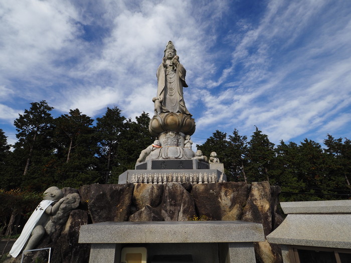 その足元には赤ん坊の石像。さらにその下には、ミニ観音像が並んでいた。水子観音というそうな。