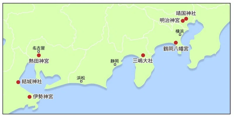結城神社は、南朝の忠臣・結城宗広を祭神として創建された神社で、熱田神宮は草薙御剣を神体とする日本屈指の大社。三嶋大社、鶴岡八幡宮はいずれも源氏からもあつく信仰された武功の神として名高い。7社には戦勝祈願にふさわしい武神と、皇室ゆかりの神社がバランスよく選ばれていた。