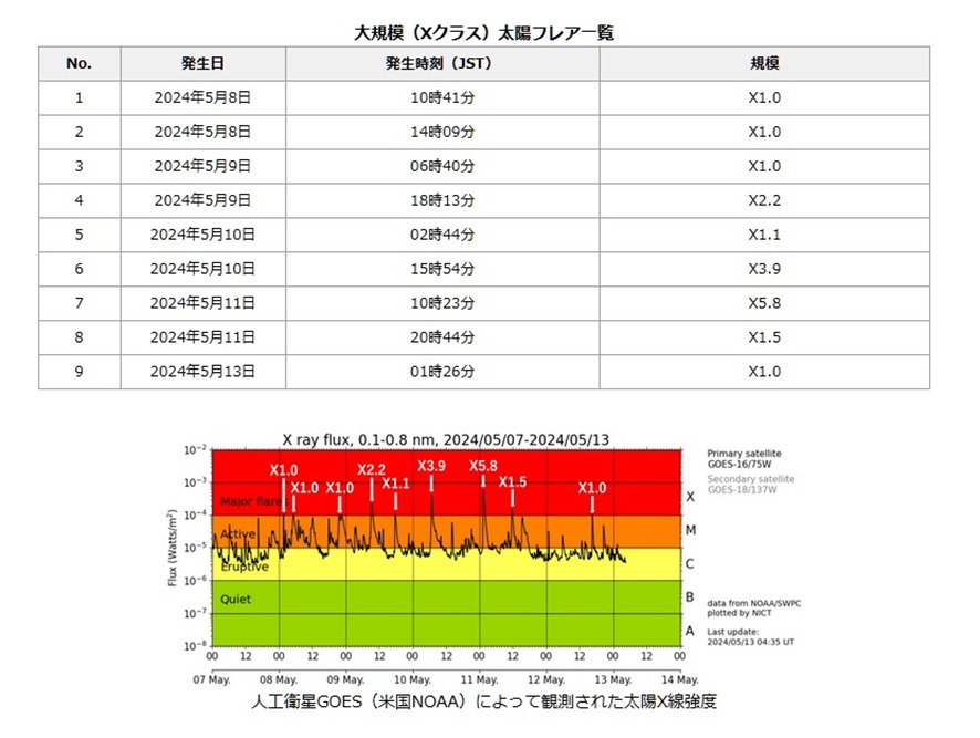 太陽フレアは太陽表面で起きる爆発現象だが、A、B、C、M、Xの順にクラス分けされている。Xクラスは太陽フレアの中で最も強力な爆発だ。直近で起きている太陽フレアを宇宙天気予報から見てみると、今年5月に入り、最大級のXクラスが毎日のように起きていることがわかる。
