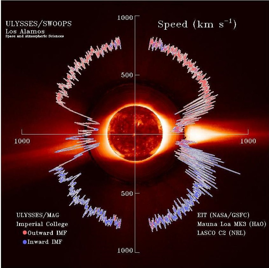 この画像は黒点の分布をまとめたものだ。太陽フレアはこの黒点が集中している部分で現れている。説明は端折るが、太陽の赤道部からは比較的速度の遅い低速太陽風、高緯度からは高速太陽風が吹き出している。