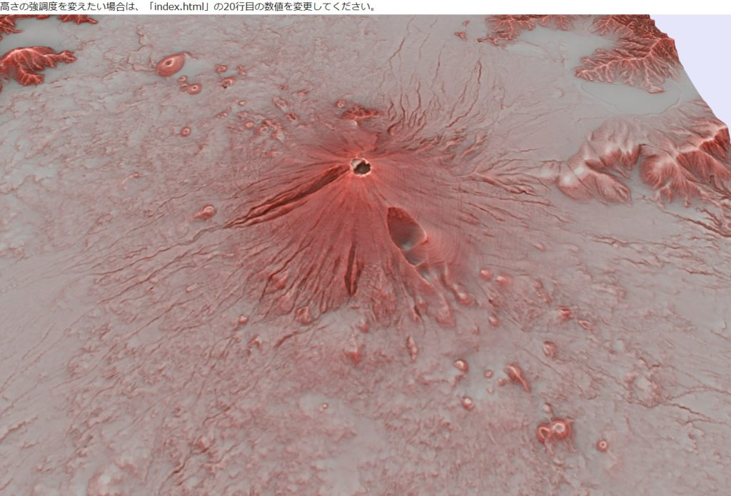 一般的には、富士山は何回かの噴火によって溶岩が積みあがってできた、と説明される。成層火山だ。そこで、以下のように、赤色立体地図を3Dで見れるようにしてみた。これを見ると富士山の周囲に小さな粒、突起がたくさんあることに気がつくはずだ。これらは小噴火口と説明されるが果たして本当にこの小さな山から噴火したのだろうか?