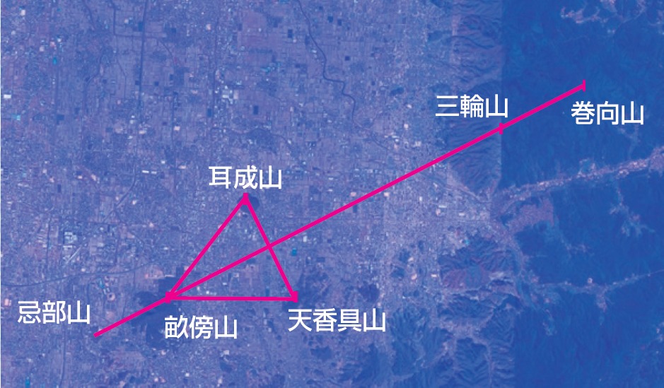 まず大和三山だけを見ると、畝傍山を頂点とする二等辺三角形が浮かびあがる。そして畝傍山から、耳成山と天香具山を結ぶラインの中心へ直角に交わる線を引き、延長すると、東北のラインは三輪山から巻向山へ、西南のラインは忌部山にぴたりとぶつかるのだ。