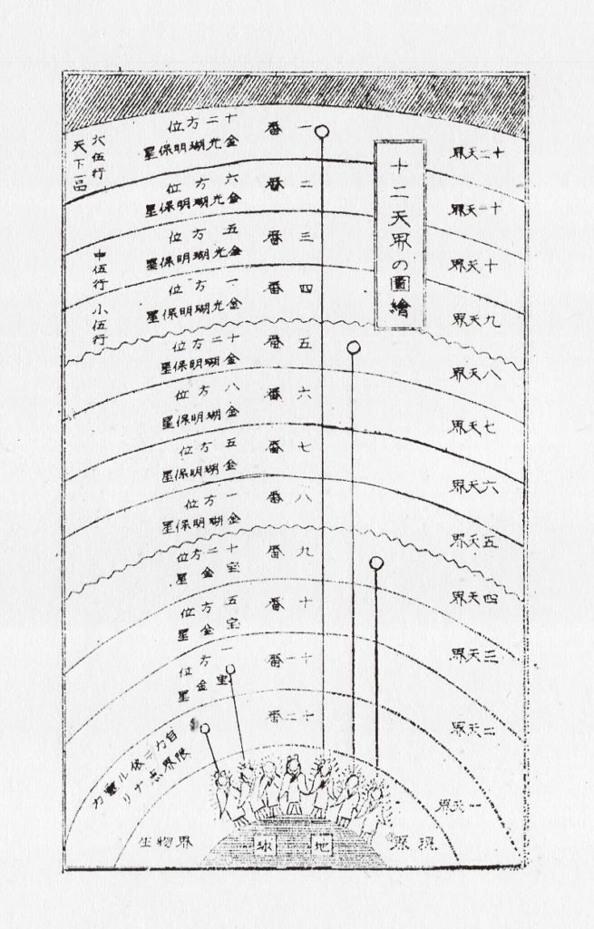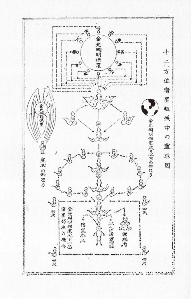 天空によれば、天界は12の階層から成る。神界を最高位として霊界・幽界・現界が連なる。人間が自力で到達できるのは最下層の第一天界までだが、宿星法を修することで、それより上(第二天界〜第十二天界)の天界にアクセスし、運命の転換が可能になるというのが天空の教えで、具体的には、修法用の霊札(表に神代文字風の異体咒字、裏に祈願人の姓名・年齢・祈願内容)を謹製して天空霊神・天啓霊神・守護霊などの降神行事を行い、定められた方位に向けて霊札を安置し、真言・手印・九字切りの神法を行った上で霊札納めの箱に納め、赤白の水引で結ぶ。この操作を繰り返すのである(天空直伝の宿星転換法は宇佐見景堂『神機霊通秘巻』に収載)。