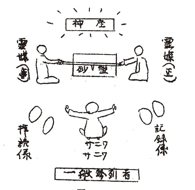 日本でも、構成は道院と変わらない。天明は正纂を正筆、襄纂を副筆、宣方を拝読係、録方を記録係と書いている(『霊現交流と審神者秘伝』)。ただし日本式では、もうひとり、「最も重大」な役職者が加えられる。神憑りの場に不可欠のサニワ(審神者)がそれなのである。