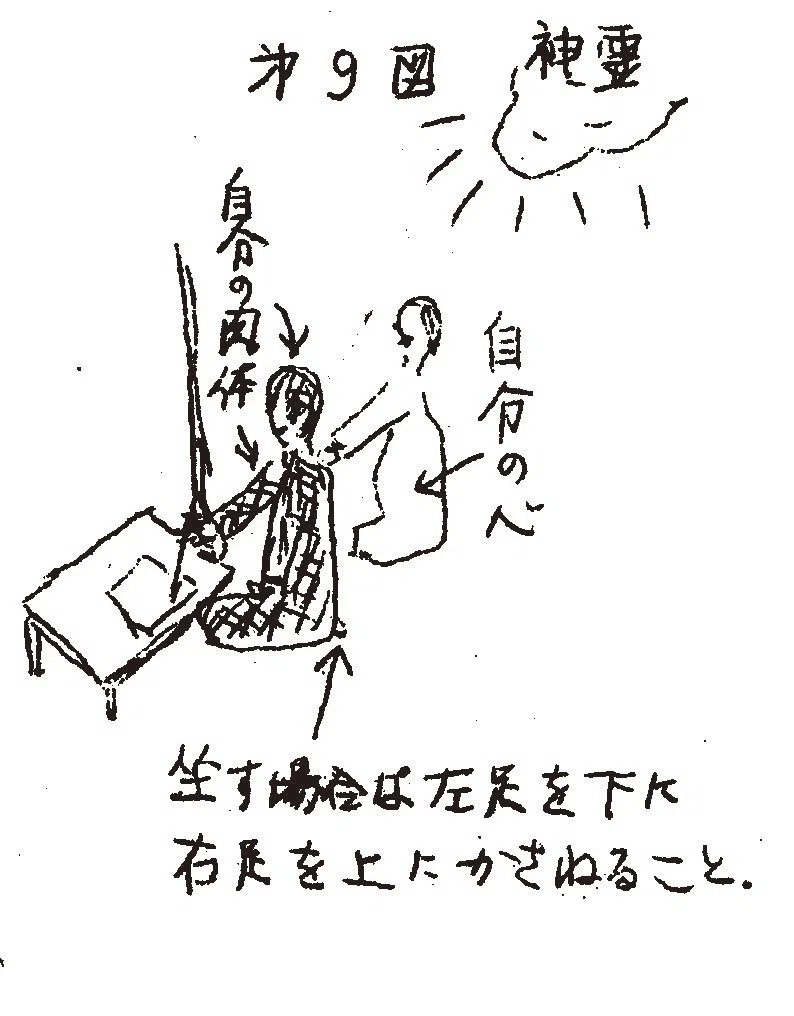 こうして霊の感応を待ち、感応があれば心によって霊に応対する。肉体は扶乩における霊媒(正筆)に相当し、心がサニワを務めるのである。