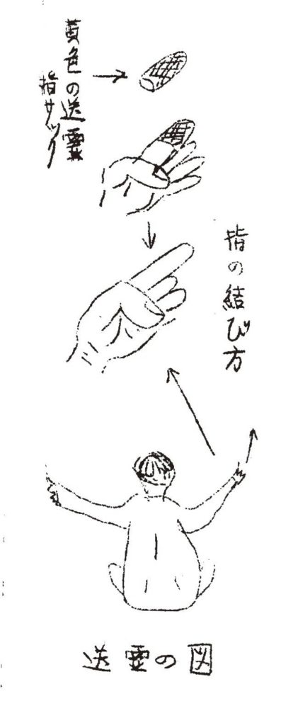 次に、乩木を手にした霊媒に向かい、自分の腕を左右に開いて送霊を行う。その際、人差し指に黄色の指サックか黄色の布を装着して行うと「霊流が強くなって効果的」であるという。