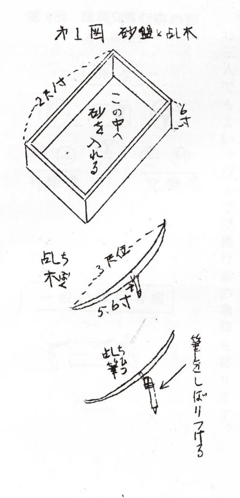 扶乩は乩木(ちぼく)と砂盤を用いる自動書記法の一種だ。乩木は長さ3尺ほどの棒で、その中央に先の尖った5、6寸ほどの木筆が取り付けられている。この乩木の両端を霊媒役のふたりが軽く持ち、その場に降臨した神仏に身心をゆだねると、木筆が勝手に動いて砂盤の砂の上に文字を書くのである。