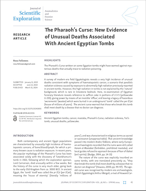 しかし今年4月に学術誌「Journal of Scientific Exploration」で発表された研究で、著者のロス・フェローズ氏はツタンカーメンの墓に3000年以上にわたって封印されたウランや有毒廃棄物から放出される有毒レベルの放射線が、人々の死の原因となったと報告している。