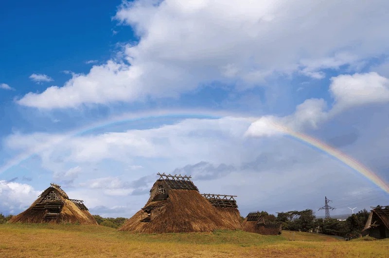 筆者は、鳥取大学の出身で(実家はちがう)、いの一番に教わった格言が、「弁当忘れても傘忘れるな」である。晴れていても雨が降り、短時間でくるくる天候が変わるのだ。妻木晩田遺跡を訪れたときも、ちょうどそういった山陰特有の日よりで、そして撮れたのが全天にかかる虹だ(学芸員のお話だと虹はとくに珍しくないそうだ)。