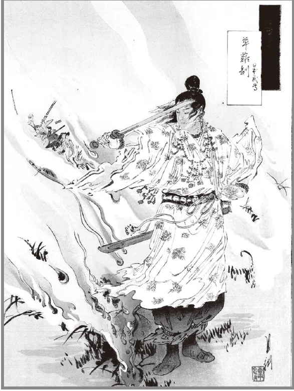 足名椎と手名椎に命じて準備万端用意された濃い酒が入った酒桶に、現れた八岐大蛇は、頭を突っ込んで酒を飲むと泥酔して寝入ってしまった。須佐之男命は、身につけていた「十拳剣」を抜いてオロチを切り刻むと、肥河の水は真っ赤な血となって流れた。そしてオロチの中ほどの尾を切ったときに、剣が刃こぼれを起こした。不審に思って尾を刺し割いてみると、一本の大刀が出てきたのだ。異なものだと感じ、天照大御神に報告し献上した。これが世にいうところの「草薙剣」である。