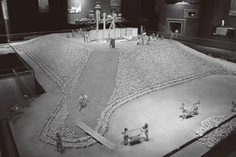 近くには「出雲弥生の森博物館」が併設され、展示コーナーの目玉は、「再現‼ 出雲の王墓」と題された縮尺10分の1の大ジオラマだ。案内板によると、男女ふたりの王が葬られていたそうで、大ジオラマの周囲をぐるりと見学すると、その独特の形をした謎の一端が解けてくるだろう。突出部(ヒトデの手の部分)を、人が歩いているからだ。
