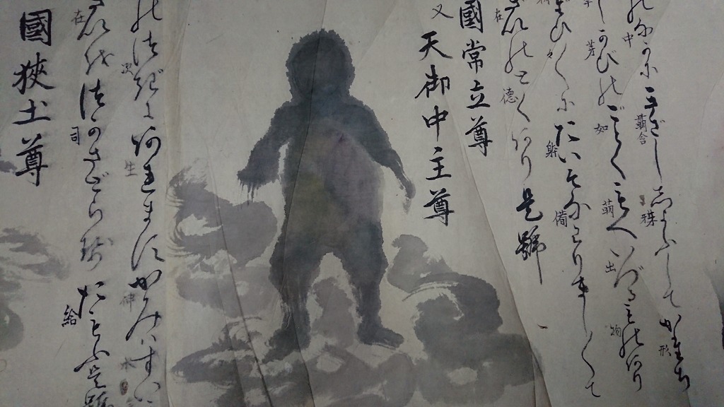 注目ポイントは、「国常立尊 又 天御中主尊」の姿として描かれた神像である。国常立尊は『日本書紀』の天地創世の場面で最初に出現する神、天御中主尊は『古事記』の天地創世の場面で最初に出現する神である。ともに神話冒頭に登場する始原の神だが、この絵巻では、全身真っ黒の、毛むくじゃらの怪物のような姿で描かれている──そう、まるでヒバゴンである!