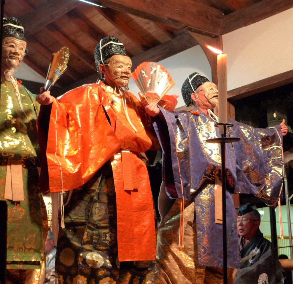 同社の翁舞は千歳(せんざい)、翁、三番叟(さんばそう)の構成となっていて、千歳の舞の後に1人の翁の舞があり、その後翁の両側に脇の翁が並び立って3人の翁の舞になり、3人の翁が退場して三番叟の舞になって終わるというものだ。能楽の原点ともされるもので、国の重要無形民俗文化財に指定されている。