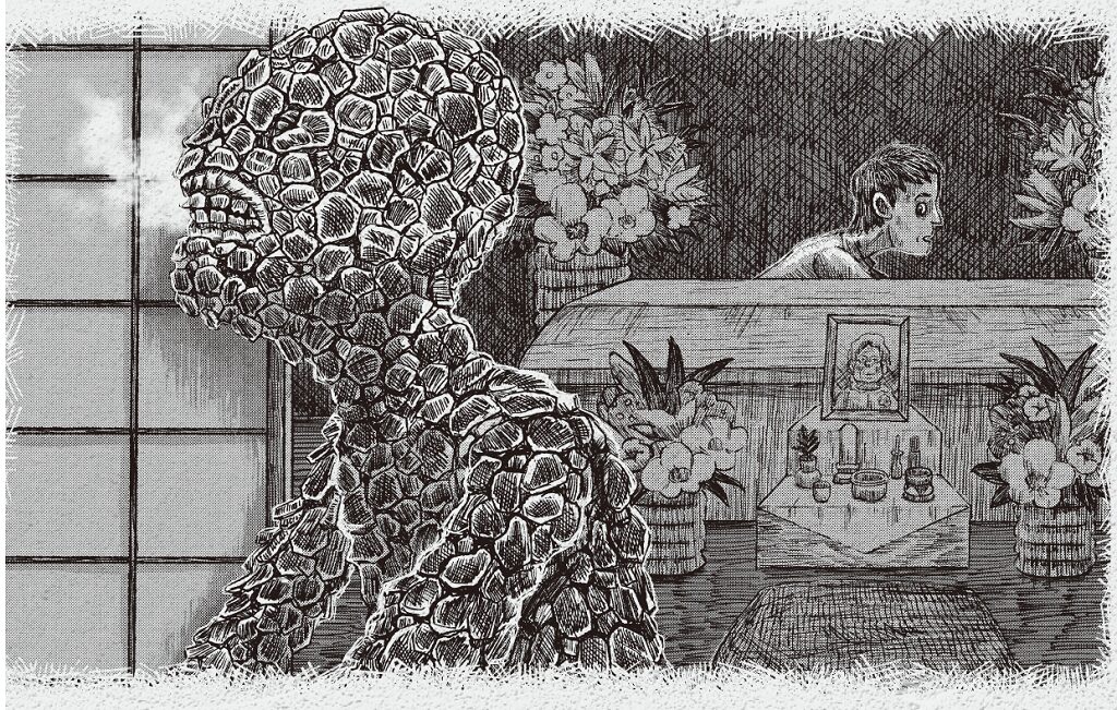 それによれば、報告者が祖母の眠る仏間に一番近い部屋で眠っていたところ、鈴の音が聞こえ、だれかが砂利を踏みしめて家に近づくような音がした。報告者は祖母が最後の挨拶に来たのかと思ったが、現れたのは全身がかさぶた、もしくは鱗のようながさがさしたものに覆われたヒトガタの何かで、報告者は必死にそれを振り払って仏間の祖母の棺桶と壁の間に隠れた。