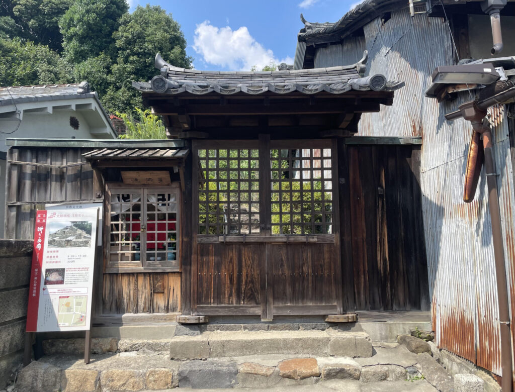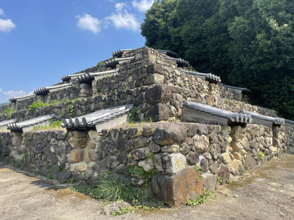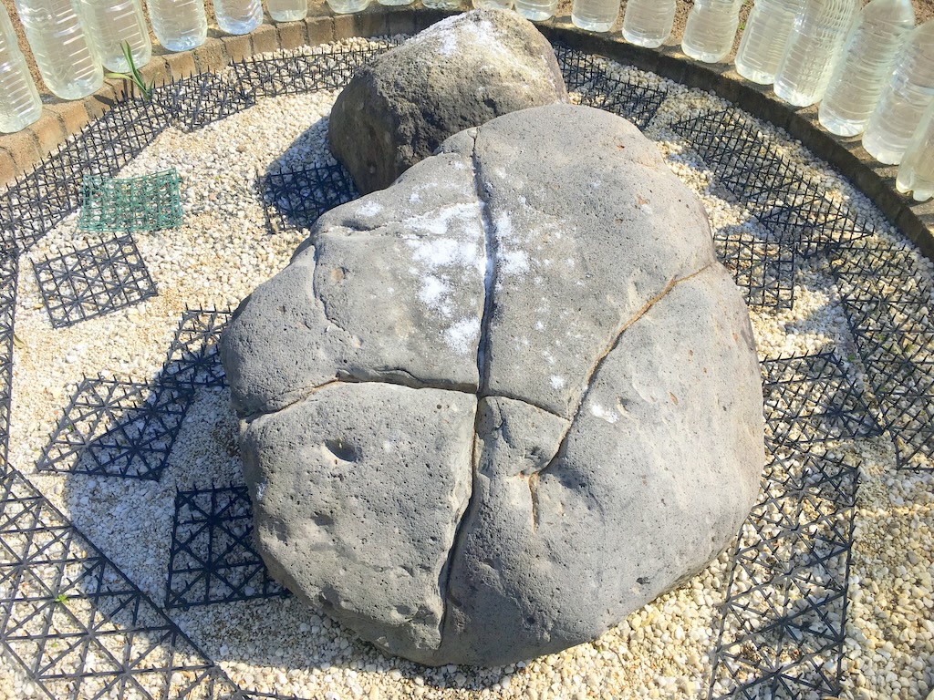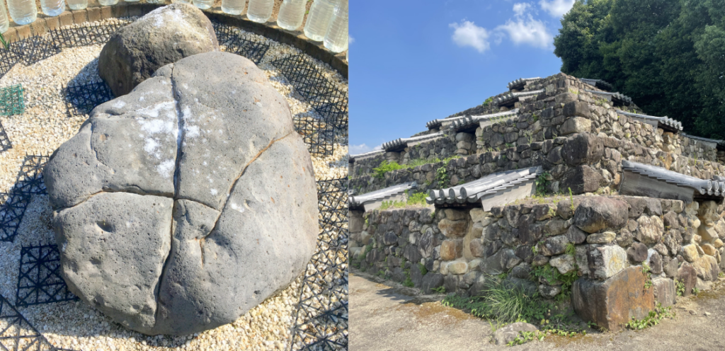 最後に頭塔と吉備塚のちょうど中間あたりに位置する「破石(わりいし)」へ案内したい。個人宅の庭にある石で普段は拝観が叶わないが、管理者のご厚意で見せていただく機会を得た。その石は両手で抱えるには少し大きく、十文字に思い切り亀裂が走っている。隣に小さな石がひとつ。