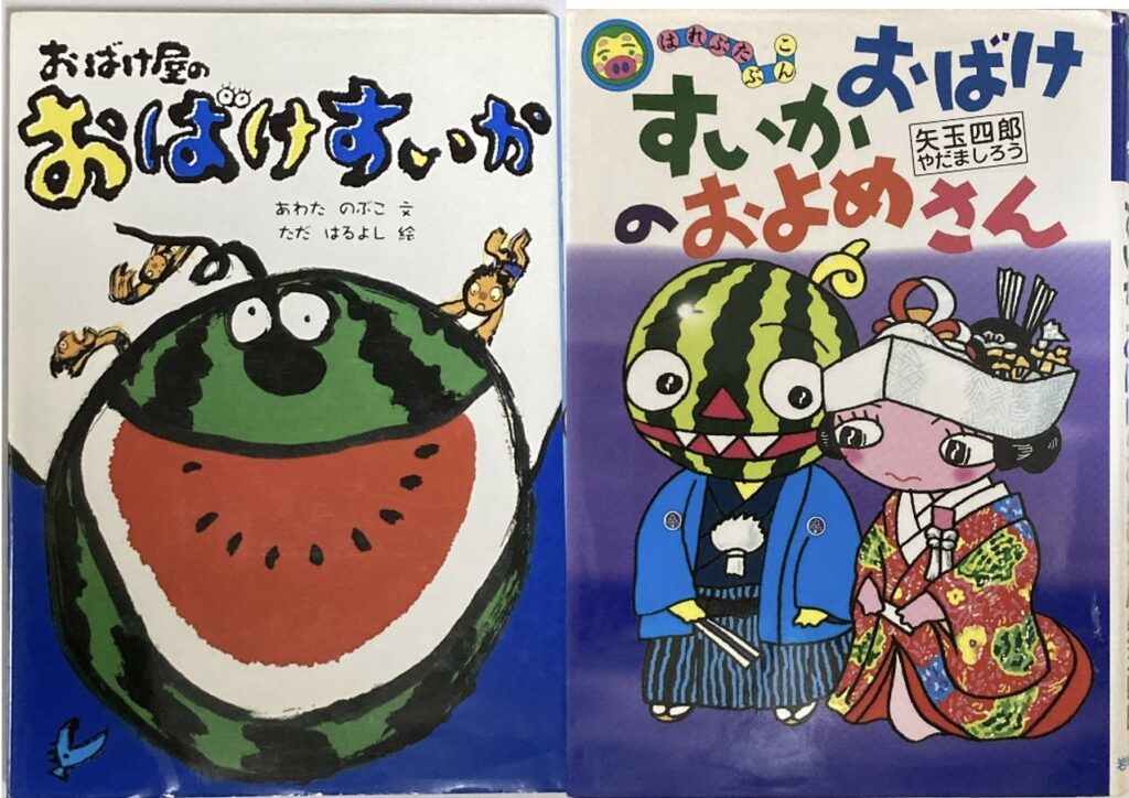 『はれときどきぶた』で知られる矢玉四郎作『すいかおばけのおよめさん』に登場するのは、西瓜の頭を持つ人型のお化けです。彼の住む「おばけの村」には【とまとおばけ】もいます。