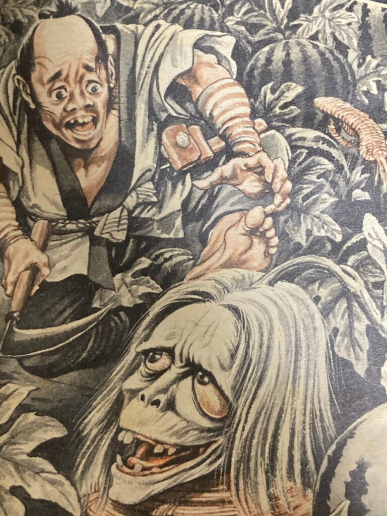 「西瓜が生首になる!」というショッキングな場面は想像を絶しますが、絵物語作家・画家の南村喬之が1968年刊行『週刊少年マガジン』32号「日本の怪談 大妖異」に、【人面すいか】として独自の「西瓜」を表現しています。