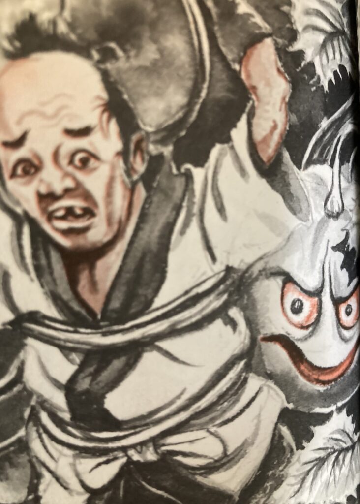 解説では「江戸の旗本やしきのすいか畑には、ときどき女の生首がなる。殺された老婆のうらみという。岡本綺堂「西瓜」から」とあります。昭和ならではといいますか、少年誌だろうとお構いなしの、まったく容赦ない恐怖描写です。この畑の持ち主のお百姓さんでしょうか。良い顔で戦慄しておりますね。おそらく同一人物らしきお百姓さんが『日本の妖怪大図鑑』にもおりました。