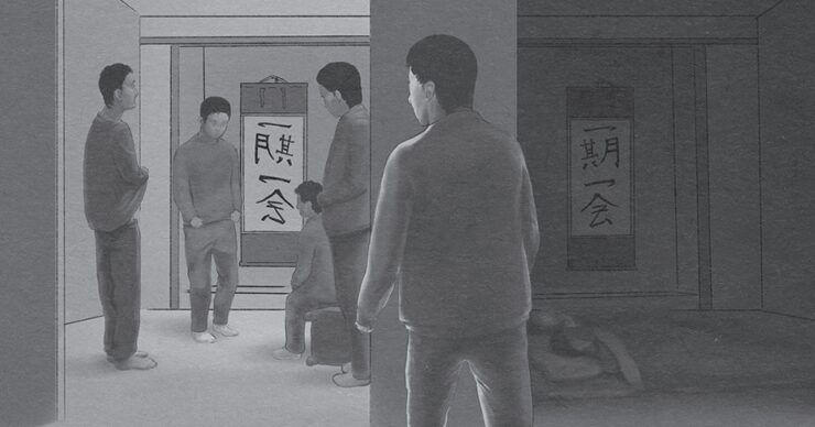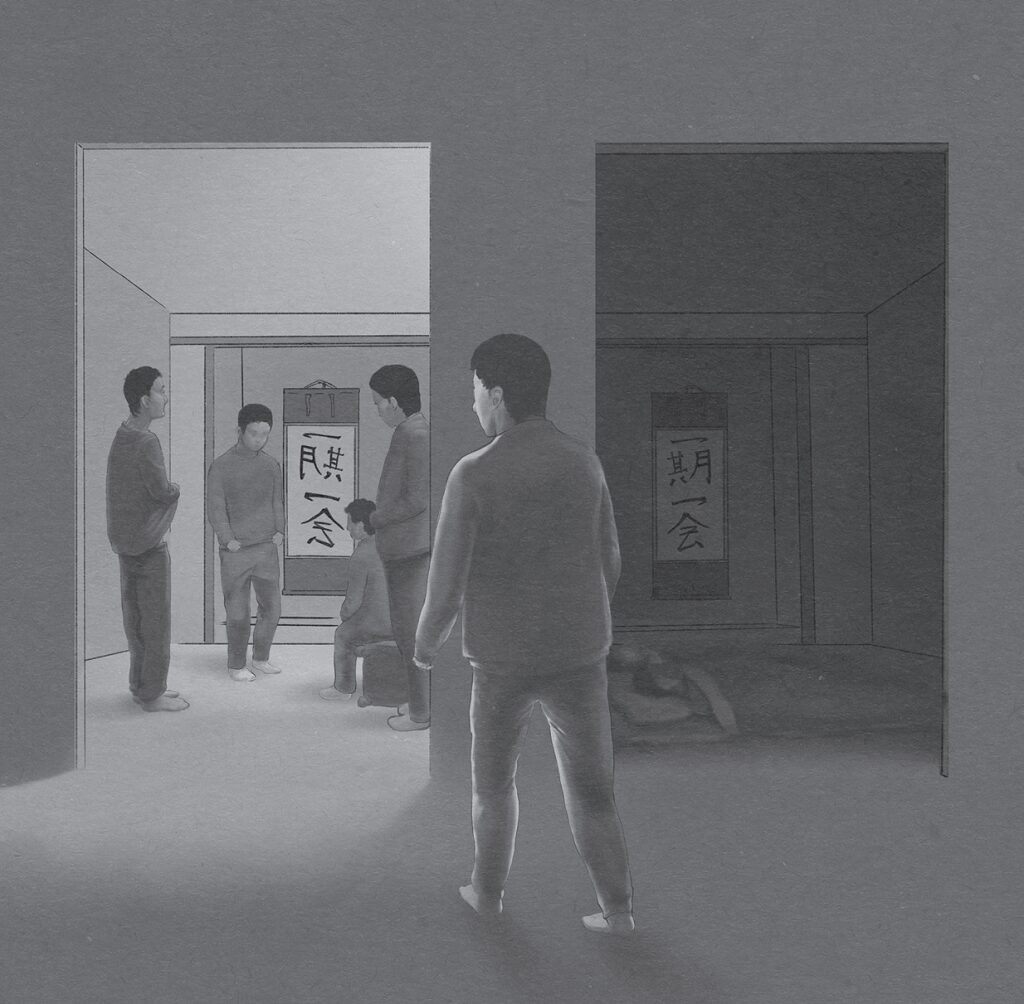 今いるところとまったく同じ広さの部屋が、扉ごしにもうひとつ。しかも向こう側の部屋は、ひどく暗い。そこは「夜」なのだ。電気も消えているし、窓の外は闇に包まれている。そして20組の布団が2列に並び、男子たちが静かに眠りについている。