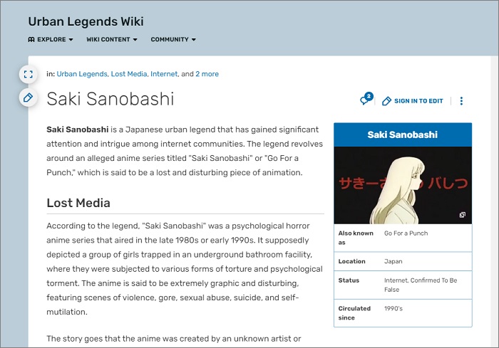 スレッド内でのやり取りから、投稿者が語ったうろ覚えの英語タイトルは『Go for a punch』。すぐに作品探しが始まったが、誰もその本編を見つけられなかった。一連の捜索の中で、誰かが作品と関係があるかもしれないとして『Saki Sanobashi』という単語を上げた。それが何を意味するかは誰にも分からなかったが、以後、一見すると日本語にも思えるこの『さきさのばし』が謎のアニメのタイトルとして定着していく。