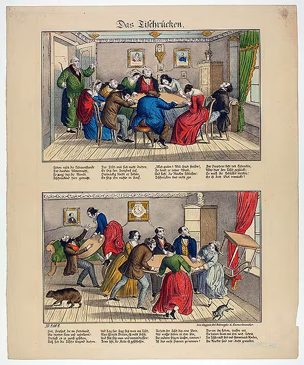 テーブル・ターニングとは降霊術の一種で、19世紀の半ばに米国で流行すると欧州に伝播、上流階級の女性たちの間やサロンで盛んに行われた。ひとりないしはグループで小さなテーブルを囲み、その上に手指をそえるだけで、テーブルがひとりでに回り、傾き、コツコツと音を立てることで霊と交信するものだ。