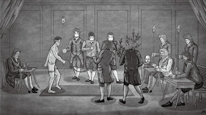 階位を受ける者は衣服を脱いでロッジの部屋に入る。この状態は生誕を意味する。先の道のりは危険がいっぱいだ。危険の数々は、人々が現実の生活で遭遇するさまざまな課題や困難を表現することを目的としていた。無知を表すために目隠しをされたが、これは私たちが人生を歩んでいく中で暗闇に置かれ、明日何が起こるかわからない状態を意味する。