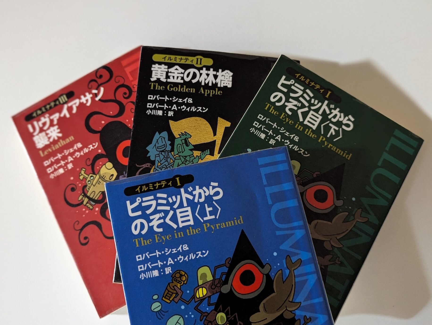 イルミナティカードのネタ元になった小説とは、ロバート・シェイ、ロバート・ウィルスンというアメリカ人作家によって書かれた、その名も『illuminatus!』(イルミナータス! ※日本語翻訳版タイトルは『イルミナティ』)。