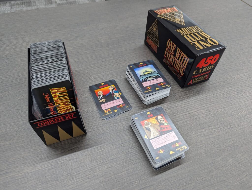 「Illuminati」は1982年の発売で、その後1994年にトレーディングカードゲームとして「Illuminati: New World Order」が発売されている。一般的というか都市伝説界隈でイルミナティカードと呼ばれているのは「Illuminati: New World Order」のほうだ。パックで販売されていた通常版と、全カードがそれぞれ1枚ずつ入ってすぐに遊べるコンプリートセット『One With Everything』が販売されていた。今回、日本語版が発売になるのはコンプリートセットである。