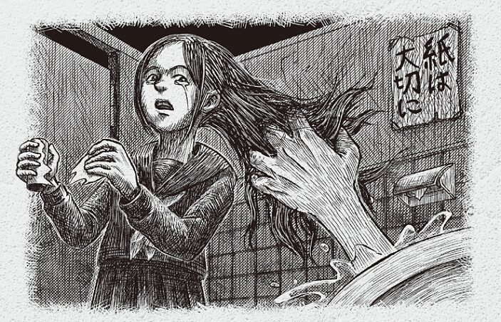 それでもなお、あの「カミをくれ」という声が聞こえてくる。少女は泣きそうになりながら「もう紙がないよ!」と叫んだ。すると便器の中から「その紙じゃない……この髪だ!」と怒鳴り声が聞こえ、直後、便器から手が伸びてきて少女の髪をつかみ、そのまま便器の中に引き摺り込んでしまった。