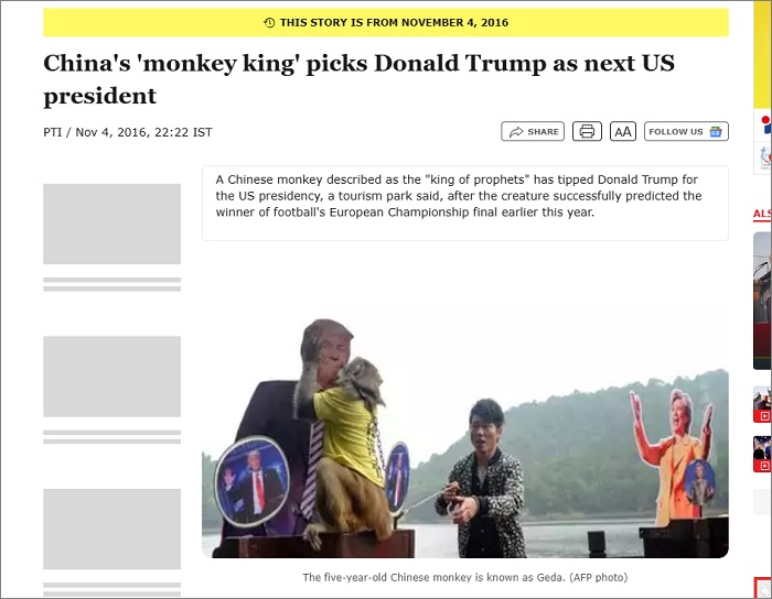 じつはトランプ氏の勝利が予言されたのは今回が初めてではなく、ヒラリー・クリントン氏と大統領の座を争った2016年にも予言者が現れている。「ゲダ」と呼ばれる中国のサルで、直前の欧州サッカー選手権でも優勝チームを予言・的中させた逸材だ。