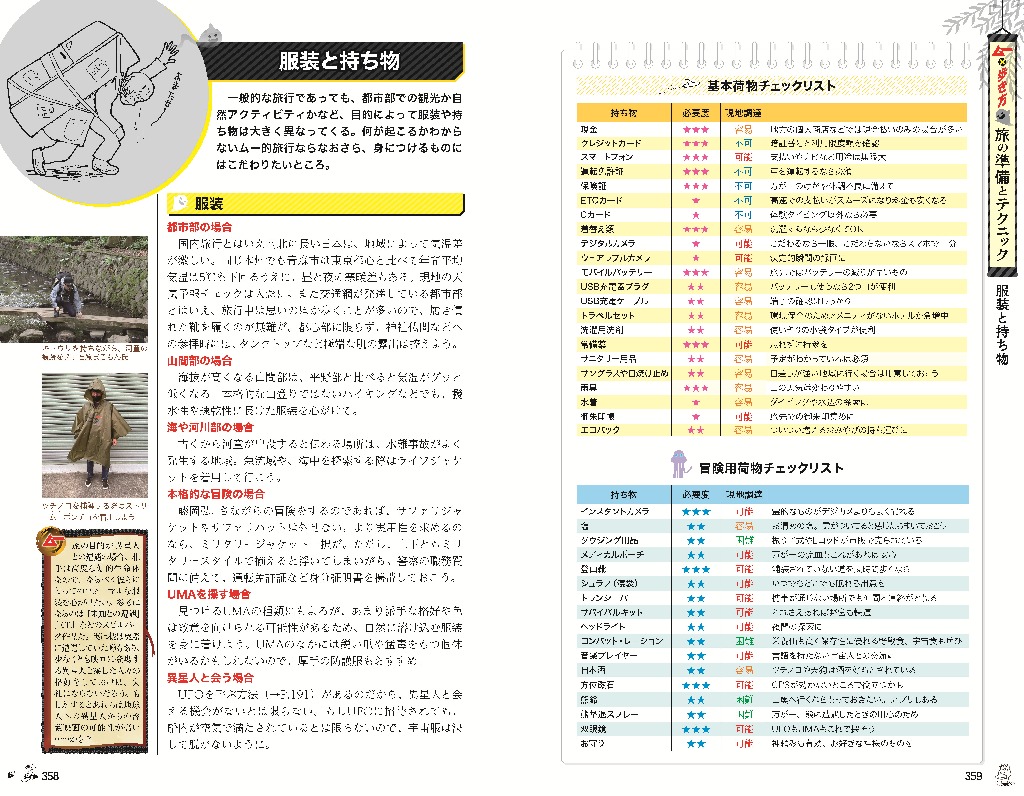 洋服・持ち物チェックリスト、手配や見積もりのだし仕方や旅行のお役立ちアプリなど初心者で安心して旅行プランがたてられるお役立ち情報はもちろん、冒険に際して留意するべき日本の法律に加えて、UFOにさらわれた時や妖怪・UMAに襲われた場合の対処法もしっかり紹介。