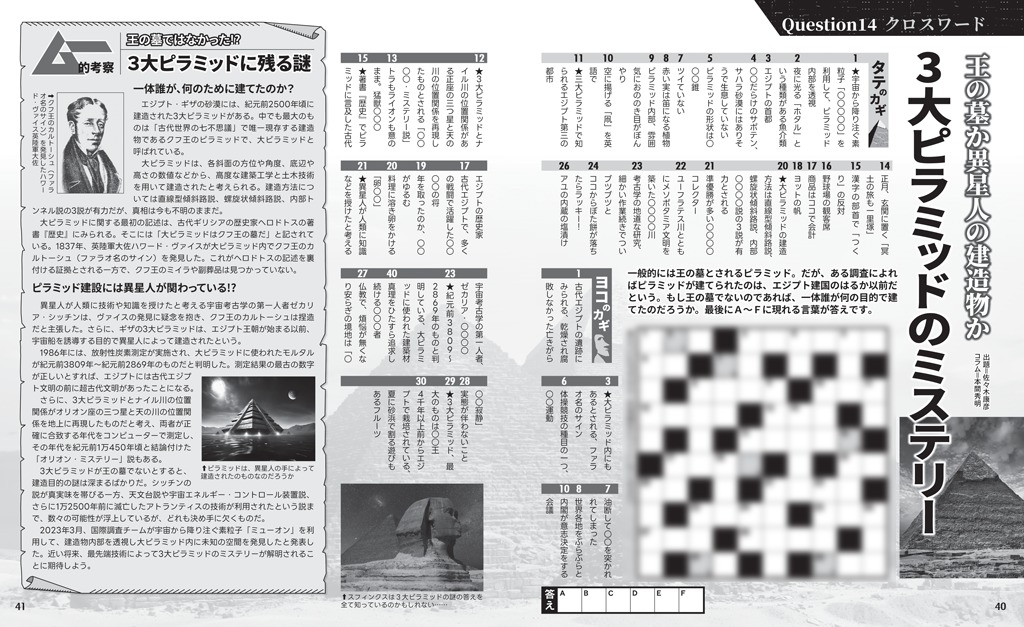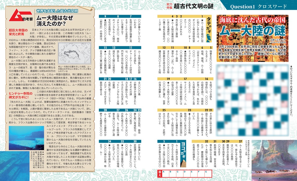 超古代文明の謎、アポロや、ピラミッドの謎、ロズウェル事件、UMAなどをテーマにしたクロスワードが多数掲載。「ムー」的知識がなくても、ムー的考察があるので、それを参考にすれば解けるはずだ。