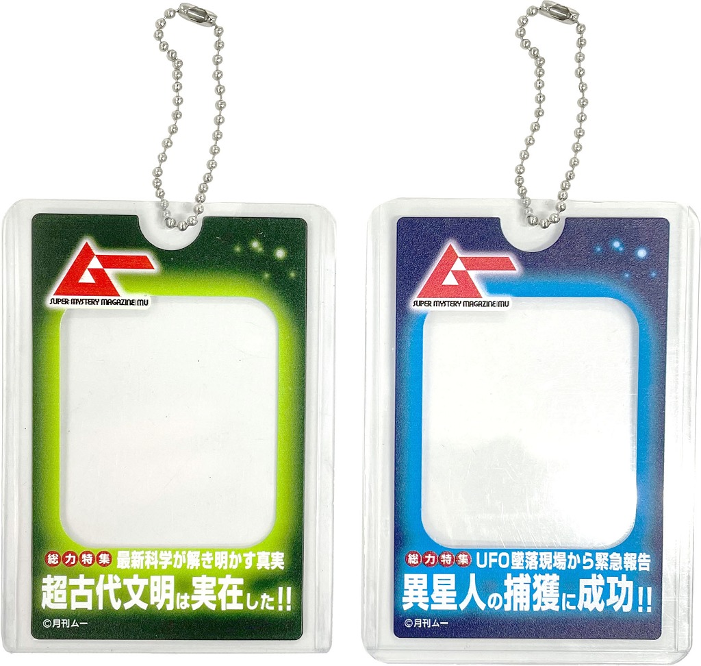 トレーディングカードなどを収納できる、キーホルダーケース。収納したら「ムー」の表紙っぽい仕様になる。あなたの推しがムー的人物に……。