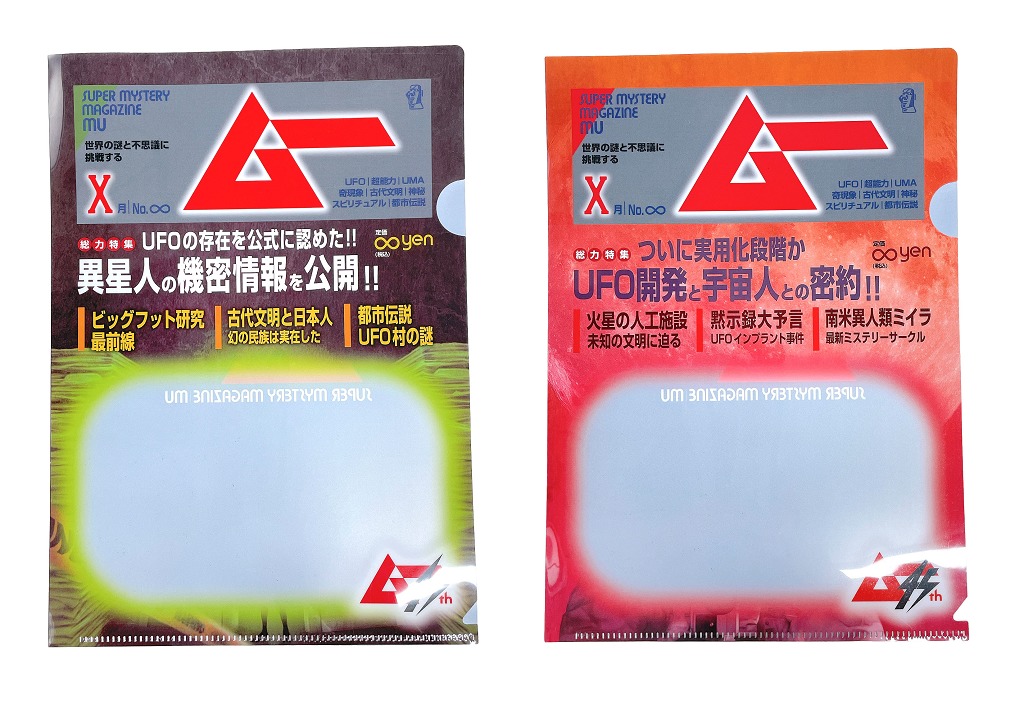 透明窓から覗く収納したものが「ムー」の表紙のように見えるクリアファイル。全2種。機密情報や密約はこのファイルで!
