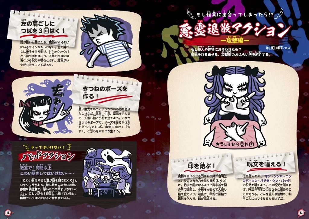 子どもにとって身近なテーマだからこそ、「もし自分の身に起きたら?」と不安になるだろう。そんな読者を安心させる「悪霊退散アクション」のコラムを掲載。「攻撃編」「防御編」「予防編」の3つのテーマで、悪霊退散の呪文やおまじない、悪霊を予防するアクションを紹介。さらには逆に悪霊を呼び寄せてしまう可能性のある「やってはいけないバッドアクション」も掲載しているぞ。