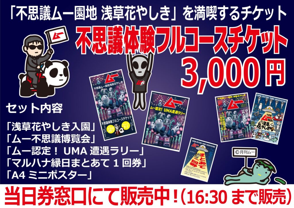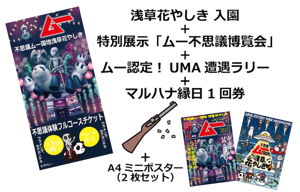 ・内容 入園+特別展示「ムー不思議博覧会 in 浅草花やしき」チケット+ムー認定!UMA遭遇ラリー+グッズ(キービジュアルA4ミニポスター2種)+マルハナ縁日まとあて1回券