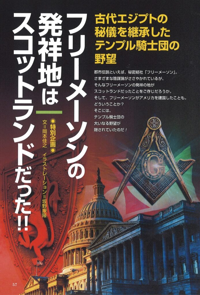 陰謀論系都市伝説といえば、今や定番の秘密結社フリーメーソンである。これまで、さまざまな噂がささやかれてきたが、その発祥地がイギリスは、スコットランドにあったことは、あまり知られていない。彼らは、フリーメーソン国家として、アメリカ合衆国を建国した。その裏には、聖地エルサレムを守ったテンプル騎士団の大いなる野望が隠されていた!!