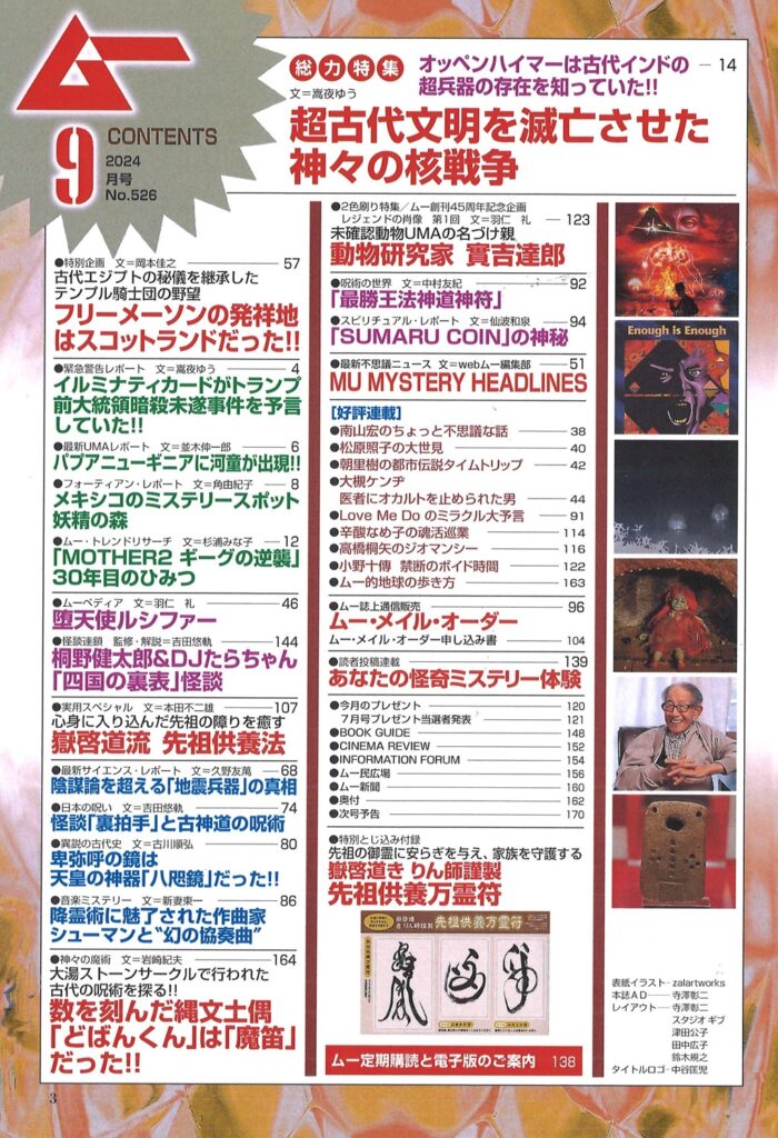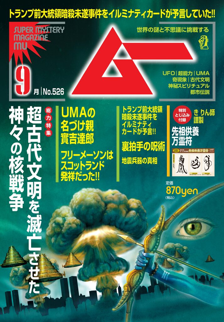 2色刷り特集 動物研究家 實吉達郎/実用スペシャル 嶽啓道流 先祖供養法/特別とじ込み付録 嶽啓道き りん師謹製 先祖供養万霊符/陰謀論を超える「地震兵器」の真相/数を刻んだ縄文土偶「どばんくん」は「魔笛」だった!!/怪談「裏拍手」と古神道の呪術/イルミナティカードがトランプ前大統領暗殺未遂事件を予言していた!!/パプアニューギニアに河童が出現!!/ほか